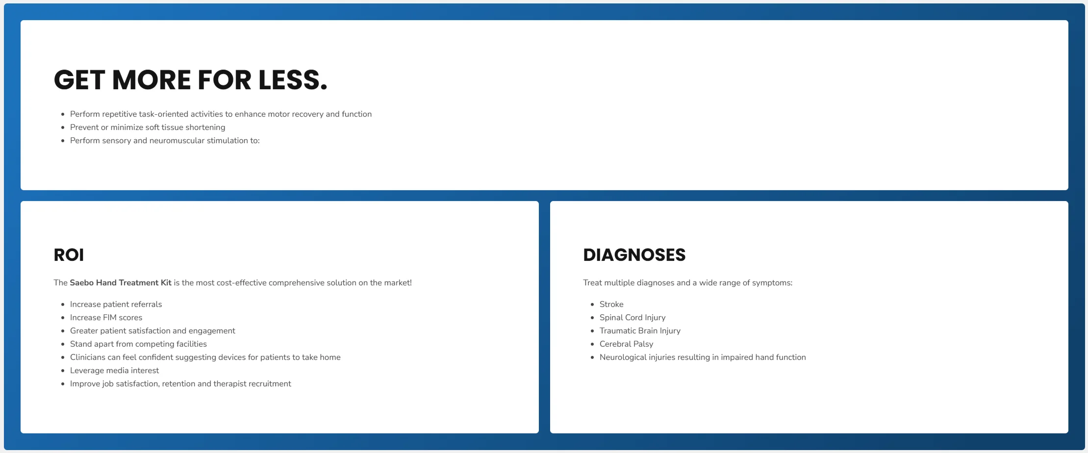 - Mechanism: The kit includes multiple sizes and resistance levels of every core Saebo product. This allows a therapist to “test-drive” a device on a patient in the clinic before recommending a specific unit for home use.