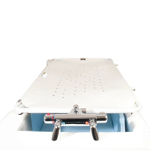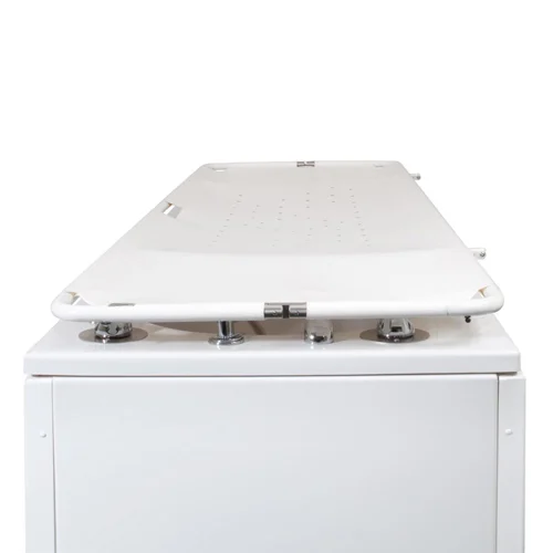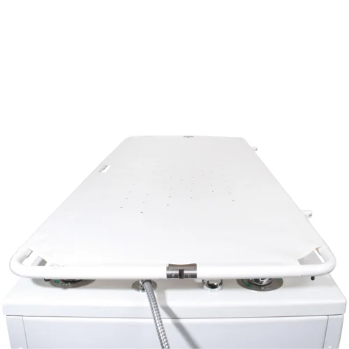 The unique Neatfold Overbath Stretcher has a patented centre-fold design that allows a client to be lifted directly upwards from the bath. The Neatfold stretcher then folds into place under them and the client can then be lowered directly onto the stretcher without ever having to be moved away.